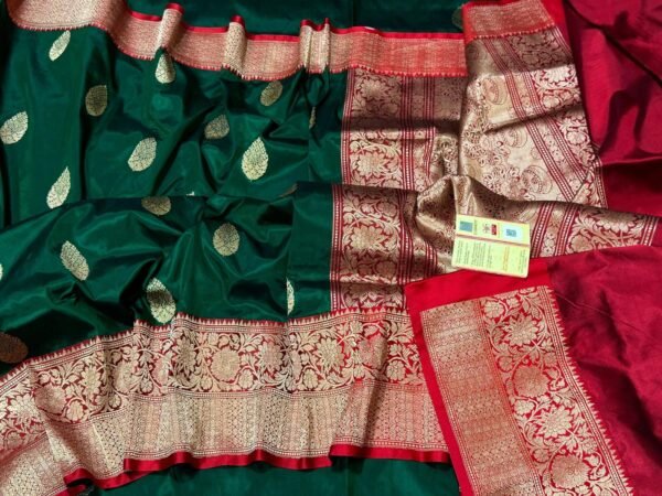 Discover the elegance of tradition with the Banarasi Pure Silk Saree in Botal Green. Crafted from premium pure silk, this saree offers a luxurious feel and a stunning drape, perfect for weddings, festivals, and special occasions.