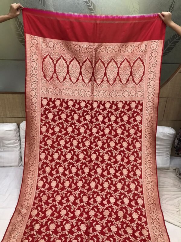 The stunning red color and intricate gold zari work make this saree truly stand out. The gold zari buti and jaal patterns cover the body, while the floral brocade border adds a rich touch to the overall design. Perfect for adding a royal, elegant look to any occasion, this saree combines heritage with contemporary charm.