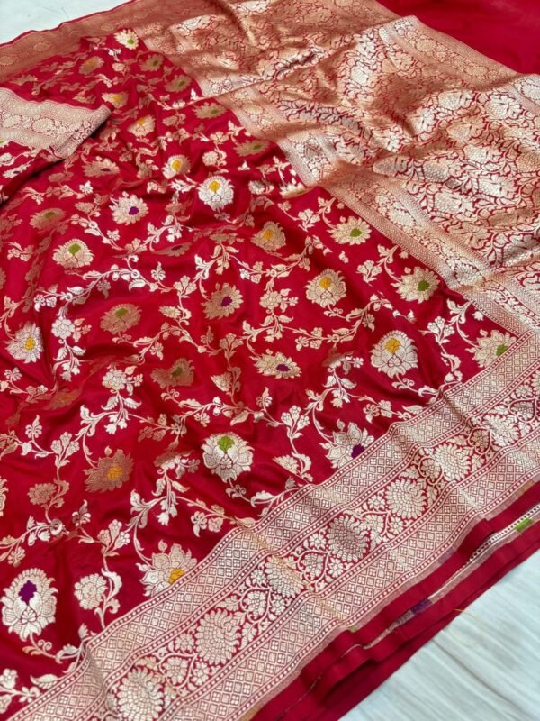 Make a statement with the Banarasi Pure Uppada Katan Saree in Red—a perfect blend of traditional craftsmanship and timeless elegance. Crafted from pure Uppada Katan silk, this saree features a rich red color, luxurious gold zari work, and intricate multi-color mina zari floral and jaal patterns. The floral brocade border at the handloom adds a touch of grandeur to the design, making it ideal for weddings, festivals, and other special occasions.