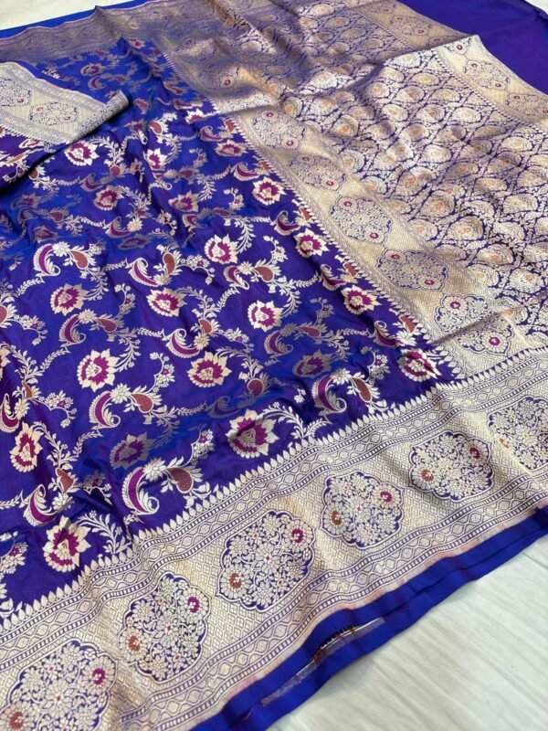 This saree features intricate gold zari floral and jaal weaving, with a gorgeous floral brocade border. The royal blue hue combined with traditional handloom artistry creates a regal look, making it the ideal choice for your next celebration.
