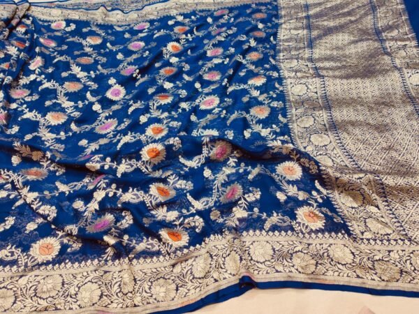 Introducing our Navy Blue Khaddi Georgette Saree, a blend of elegance and tradition. Crafted with intricate gold Zari work and featuring a mesmerizing Jaal weaving design, this saree exudes sophistication. With a length of 5.5 meters and a 1-meter blouse piece, it offers versatile styling options for any occasion. Elevate your ethnic wardrobe with this timeless piece that celebrates Indian craftsmanship and style.