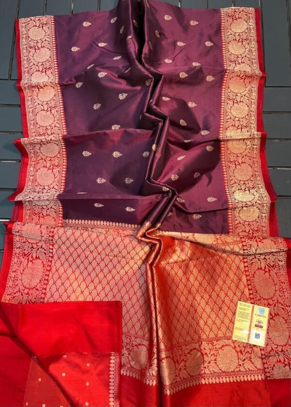 Shop Pure Handloom Banarasi Katan Silk Saree in wine purple with antique zari, contrast border & blouse. Silk Mark Certified, 5.5 MTR saree + 1 MTR work blouse.