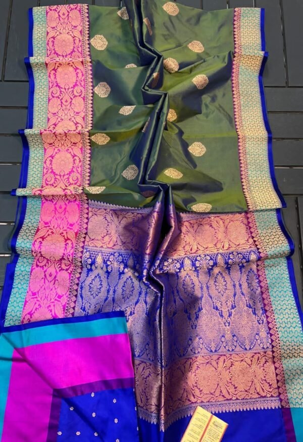 Buy Pure Handloom Banarasi Katan Silk Saree in green with pure antique zari, contrast border & rich pallu. Silk Mark Certified. Includes full work blouse. Shop now!