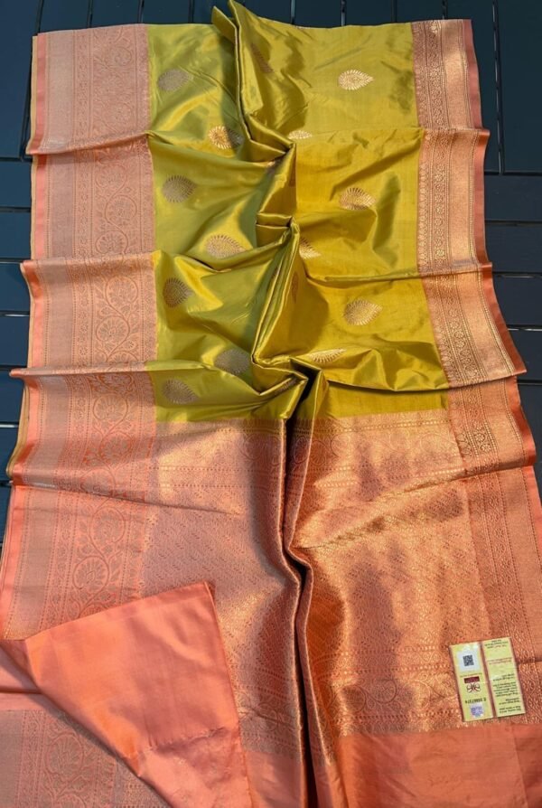 Shop the elegant Pure Handloom Banarasi Katan Silk Saree in olive green with antique zari, floral weaving, rich contrast pallu & full work blouse. Silk Mark Certified. Perfect for festive occasions.